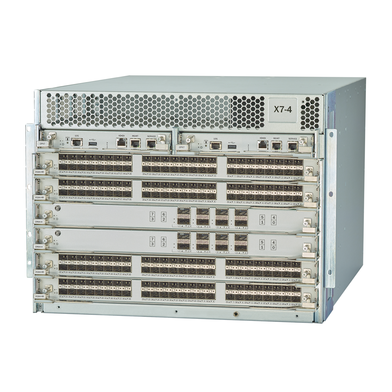 • Two modular form factors: 14U X7-8 with eight vertical port blade slots for large enterprise networks and the 8U X7-4 with four horizontal port blade slots for midsize networks.