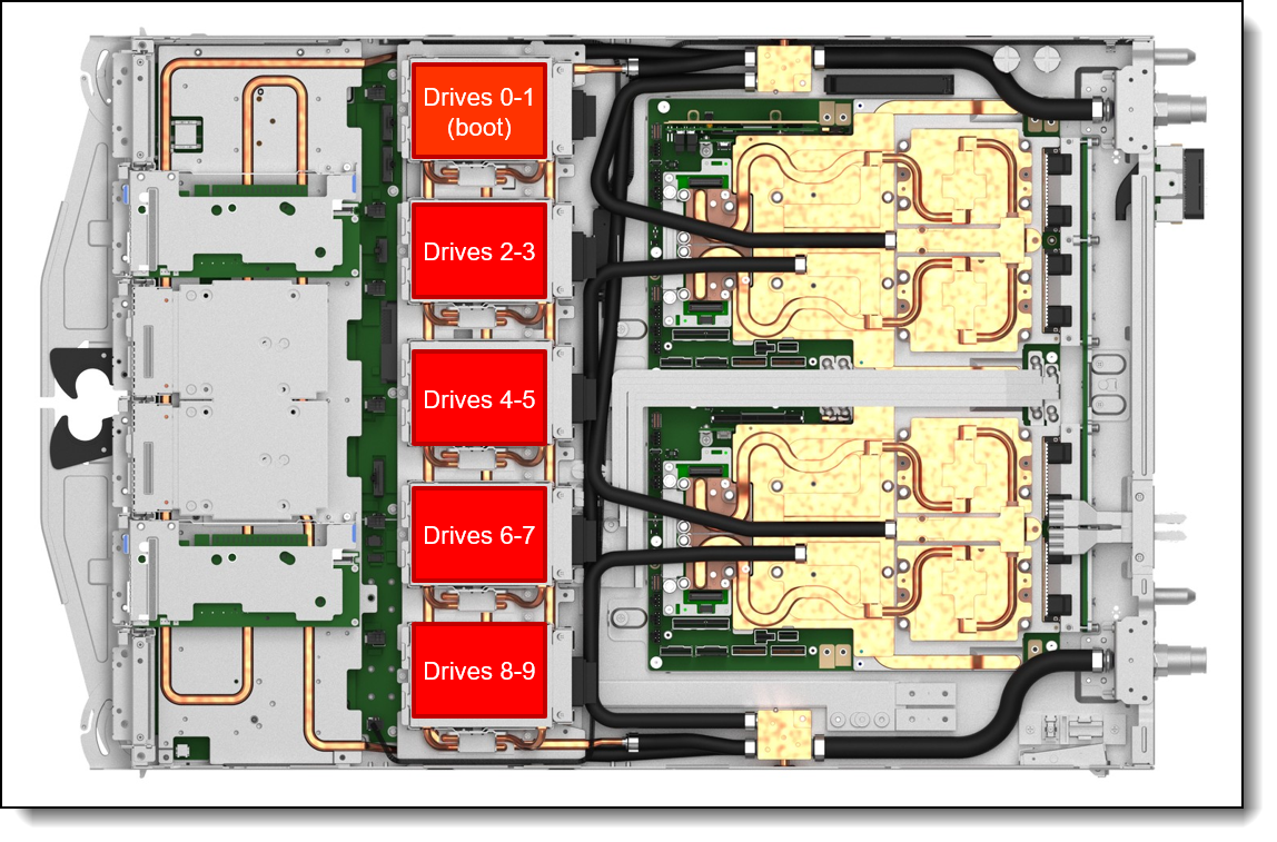 - All supported drives are E3.S NVMe drives with PCIe Gen 5 x4 host interface, to maximize I/O performance in terms of throughput, bandwidth, and latency.