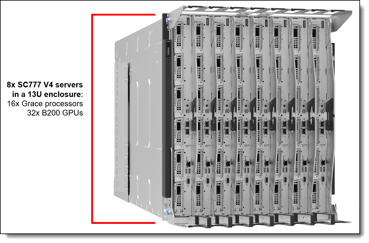 The ThinkSystem SC777 V4 server uses a new design, where the servers are mounted vertically in the N1380 enclosure. Eight servers are installed in one 13U N1380 enclosure.