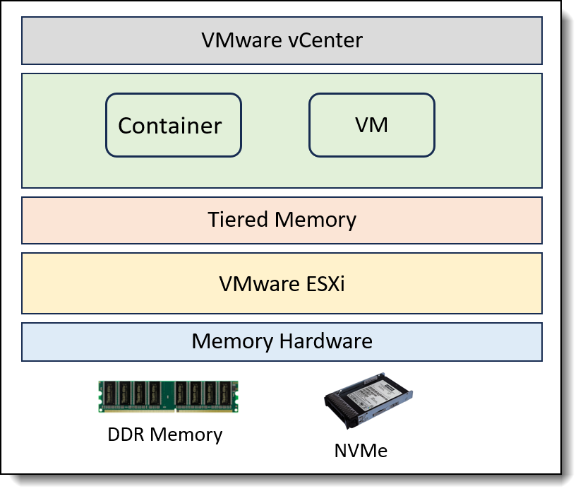 VMware's memory management plays a vital role in the implementation of memory tiering, as the ESXi hypervisor employs intelligent memory allocation. By dynamically placing frequently accessed data in the faster DRAM and less frequently used pages in the NVMe tier, this approach leverages a tiered memory architecture to create an expanded memory pool that can accommodate diverse performance requirements. Notably, this tiering process is entirely transparent to the application, ensuring seamless compatibility with all types of workloads, regardless of their specific demands or characteristics.