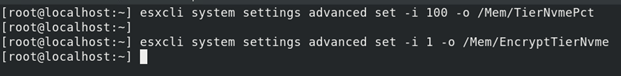 esxcli system settings advanced set -i 100 -o /Mem/TierNvmePct esxcli system settings advanced set -i 1 -o /Mem/EncryptTierNvme