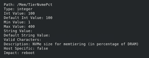 - Mem.TierNvmePct: This setting determines the amount of NVMe to be used as tiered memory, expressed as a percentage of the DRAM capacity. The default value is 100, which means that the host is configured to use a 1:1 DRAM:NVMe ratio. For example, a host with 1TB of DRAM would use 1TB of NVMe as tiered memory.