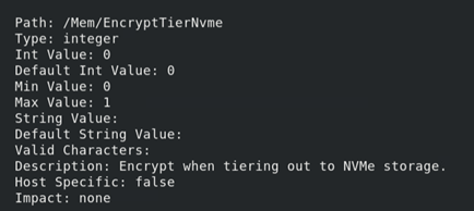 - Mem.EncryptTierNvme: This setting enables the encryption of VM memory pages when tiering out to NVMe storage, providing an additional layer of data security. The default value is 0, indicating that encryption is disabled by default.