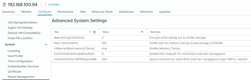 - When enabling memory tiering over NVMe, there are two optional host advanced settings that can be configured: Mem.TierNvmePct and Mem.EncryptTierNvme, as illustrated in Figure 10. After modifying these host advanced settings, it is necessary to reboot the host in order for the changes to take effect.
