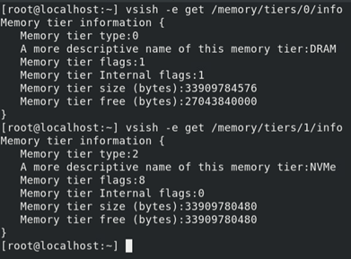 - Use the command displayed in Figure 15 to view detailed information about Tier 0 and Tier 1 memory, This command provides insights into the memory hierarchy, where Tier 0 represents the amount of DRAM present in the system, and Tier 1 represents the amount of NVMe device being utilized as tiered memory, effectively expanding the system's memory capacity.