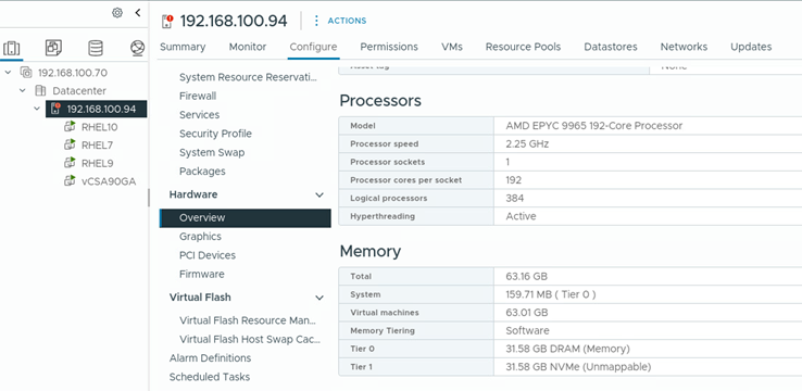 In this section, we outline the steps to configure and enable memory tiering on a VMware ESXi 9.0 host. The test configuration used in this scenario is based on the ThinkSystem SD535 V3, with detailed specifications listed in the following table.