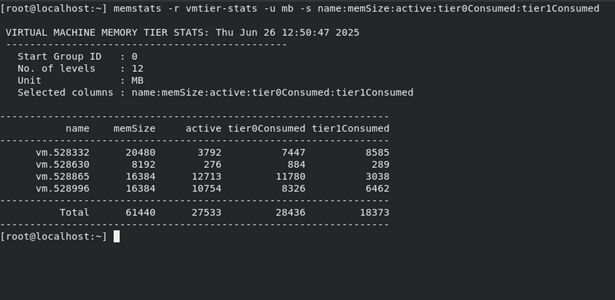 VMware provides the memstats utility which includes a new report type called vmtier-stats. This report offers a range of metrics that can be used to monitor the amount of VM memory that has been offloaded to Tier 1 memory compared to Tier 0 memory.