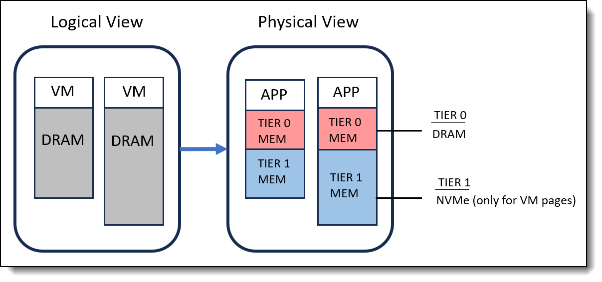 As shown in Figure 2, memory tiering integrates DRAM (TIER 0) with slower NVMe memory (TIER 1) to form a contiguous memory space. Through intelligent and proactive page placement, memory pages are dynamically allocated between the primary DRAM and secondary NVMe tiers. Specifically, memory pages from NVMe are utilized exclusively for VM memory allocation on the ESXi host, ensuring efficient use of resources.