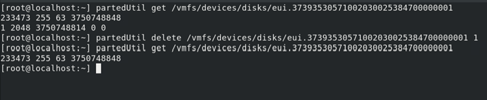 partedUtil get /vmfs/devices/disks/eui.37393530571002030025384700000001 partedUtil delete /vmfs/devices/disks/eui.37393530571002030025384700000001 1 partedUtil get /vmfs/devices/disks/eui.37393530571002030025384700000001
