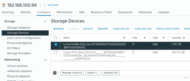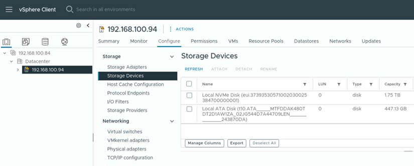 - Select the ESXi host and navigate to the Configure tab, then click on Storage and select Storage Devices.