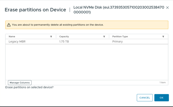 - If an existing partition is present on the NVMe device, delete it by selecting the "ERASE PARTITIONS" option, which will remove all partitions from the selected disk, as illustrated in Figures 6 and 7. This step is necessary to ensure that the NVMe device is properly prepared for use with memory tiering.