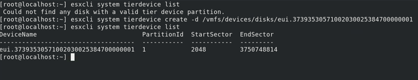 esxcli system tierdevice list esxcli system tierdevice create -d /vmfs/devices/disks/eui.37393530571002030025384700000001 esxcli system tierdevice list