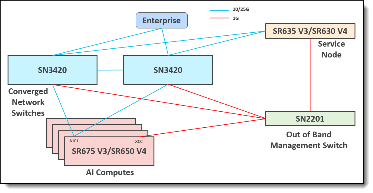 The default setup of the Lenovo Hybrid AI 221 platform leverages NVIDIA SN3420 switch for Converged Network and the NVIDIA SN2201 switch for out-of-band management. As an alternative, Cisco Networking with the Cisco Nexus 93240YC-FX2 for the Converged Network and the Nexus 9300-FX3 for the Management Network can also be used. A 10/25GE adapter with minimum 2 ports is added to both AI computes and service nodes.
