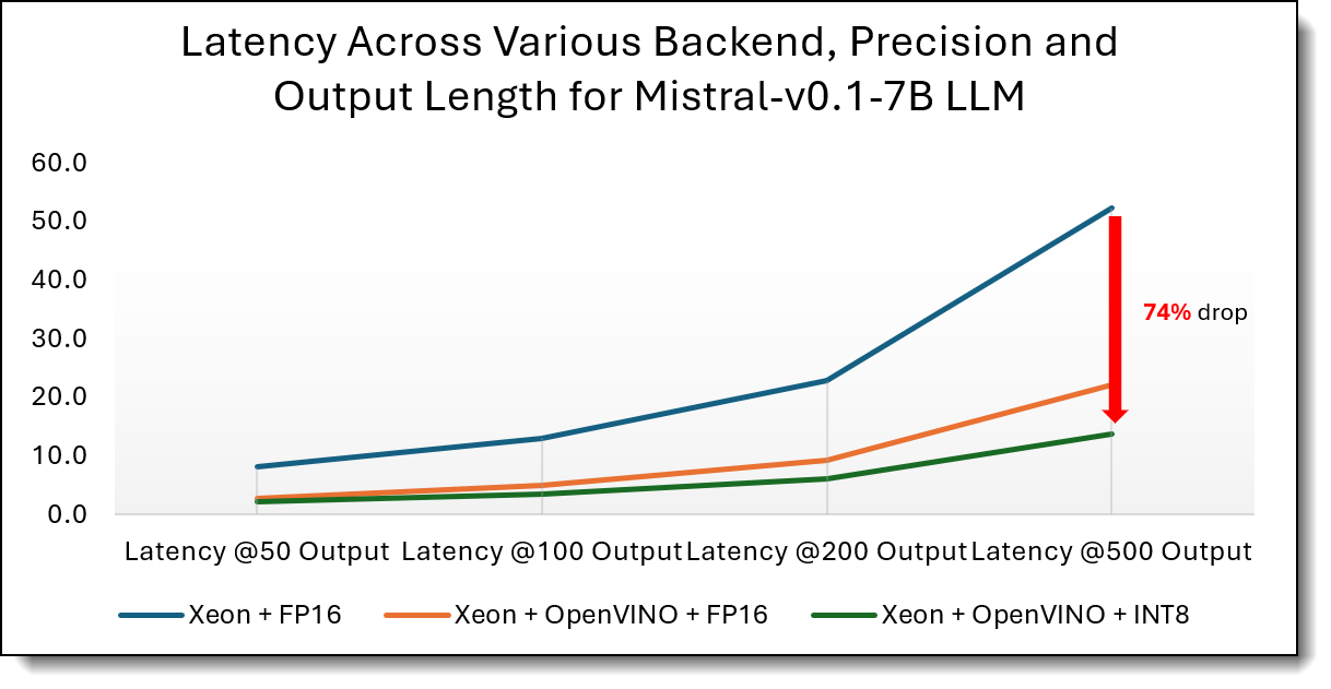 The data and figures below show that generation latency grows linearly with output length for both Phi-3.5-vision-4B and Mistral-7B models, making per-token efficiency the dominant factor for long responses. Across all output sizes, OpenVINO significantly reduces total generation time compared to native FP16 execution, with INT8 consistently delivering the lowest latency. For Phi-3.5-vision-4B, OpenVINO INT8 achieves up to a 97% reduction in total generation latency at long output lengths, while Mistral-7B shows a 74% reduction, demonstrating that low-precision inference is especially effective in controlling latency growth as output length scales.