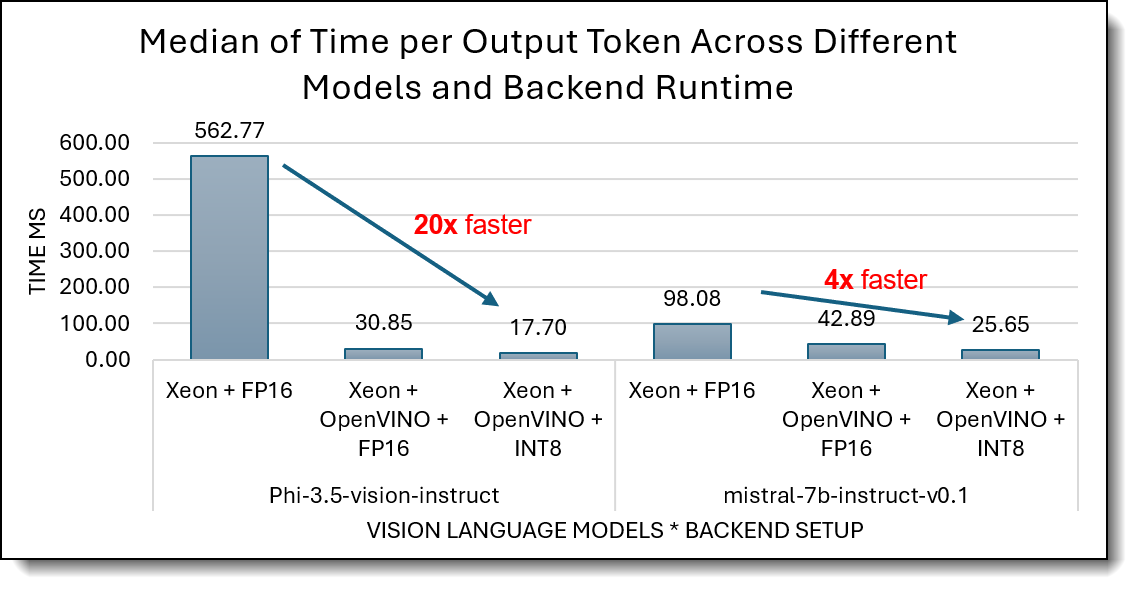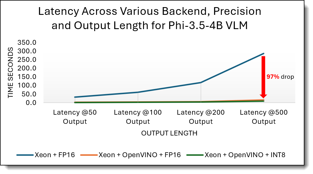 - For Phi-3.5-vision-instruct, native FP16 produces slow generation (about b560 ms/token), while OpenVINO FP16 (31 ms/token) and OpenVINO INT8 (18 ms/token) reduce latency by 18× and 30×, respectively. These improvements stem from optimized kernel execution, reduced precision compute, and efficient operator fusion.