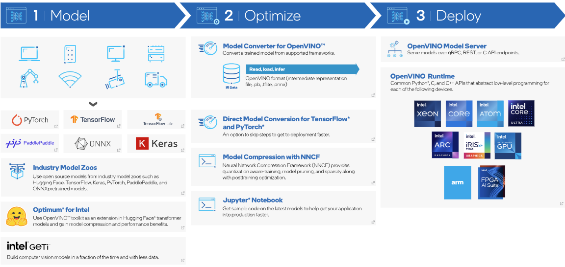 This workflow below illustrates how OpenVINO enables an end-to-end path from model development to optimized deployment across heterogeneous Intel architectures. By supporting direct model conversion, low-precision optimization, and a unified runtime, OpenVINO allows vision and language models to be efficiently deployed on Xeon CPUs and other Intel platforms without changing application logic.