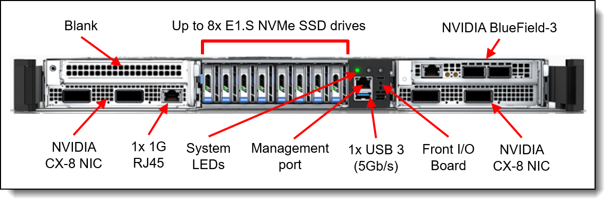 - All drives are E1.S NVMe drives with PCIe Gen 5 x4 host interface, to maximize I/O performance in terms of throughput, bandwidth, and latency.