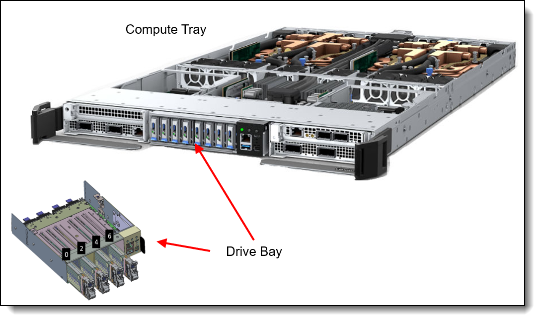 - Each compute tray also supports up to 8x E1.S 3.84T drive bays, depending on the configuration, for internal storage and 1x 1.92T M.2 NVMe SSD for OS boot