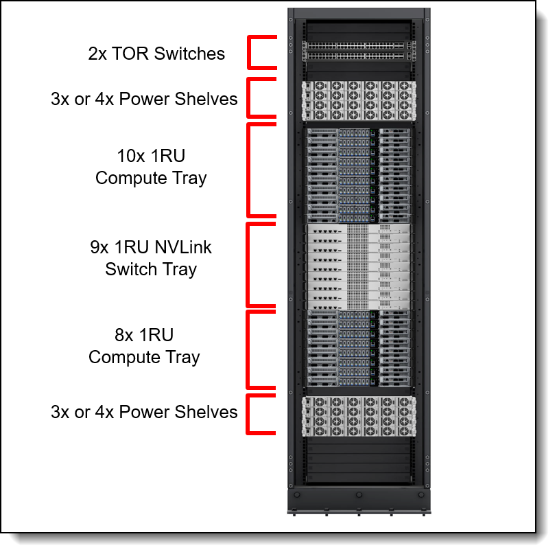 - One rack with 1U Compute Trays, 72 GPUs with NVLINK with non‑scalable (NVLink domain is contained within a single rack; no inter‑rack NVLink scaling) NVSwitches.