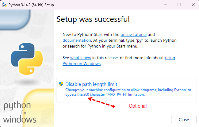 - At the end of the installation, you'll see the following windows. Optionally click Disable path length limit if you want to run Python from a folder other than the installation directory.