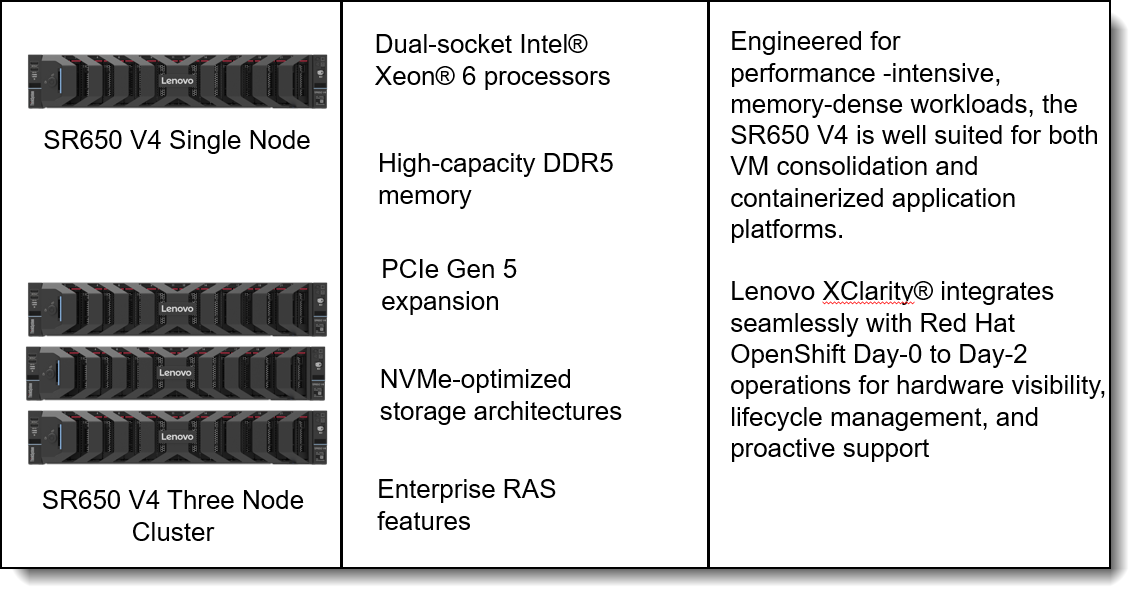 Together, Lenovo ThinkSystem SR650 V4 and Red Hat OpenShift Virtualization provide a scalable, future‑ready foundation that simplifies virtualization modernization and supports hybrid cloud and application transformation initiatives.