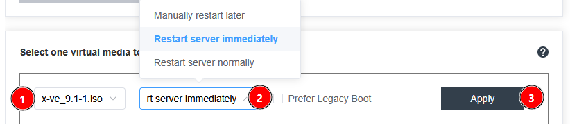 - Select the ISO in the first dropdown list and then select Restart server immediately from the second dropdown list, then click Apply.