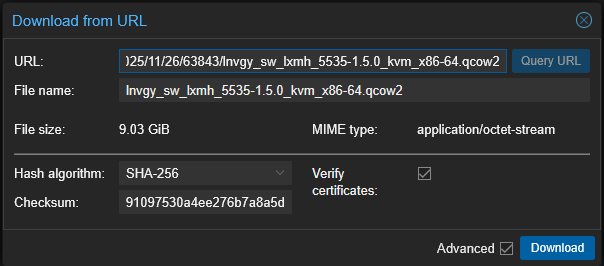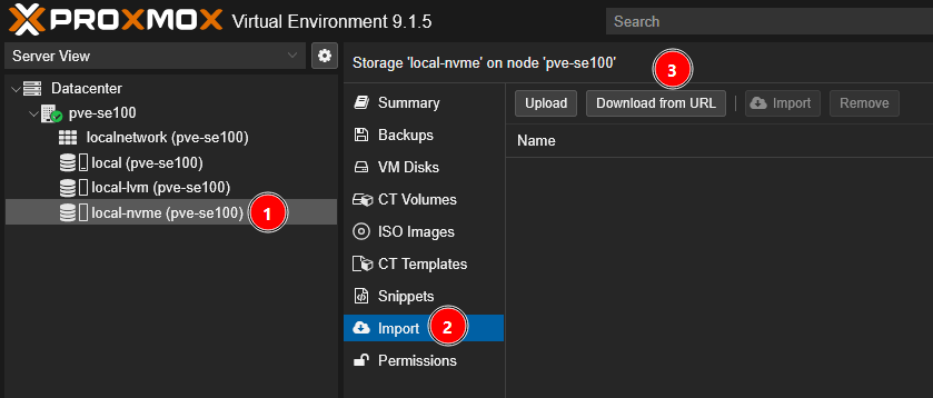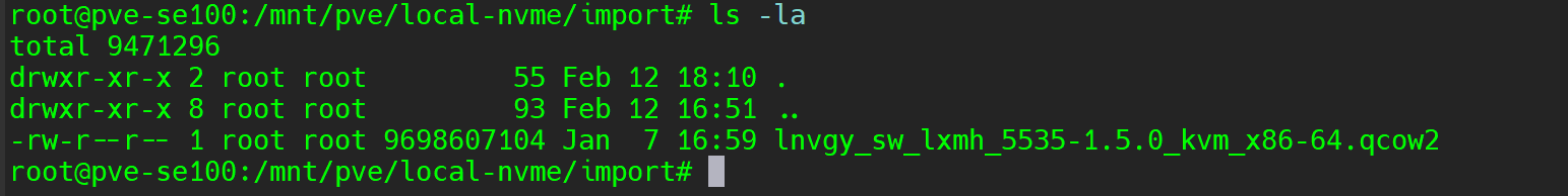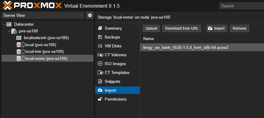 At the end, the file will be stored in the “Import” section (i.e., into /mnt/pve/local-nvme/import directory on the local disk).