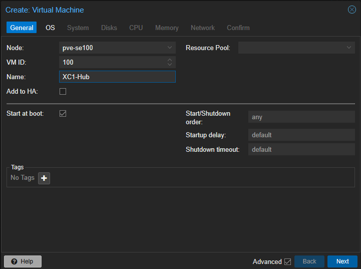 - Give the VM a name and enable Start at boot (so it restarts automatically after a power loss). Click Next.
