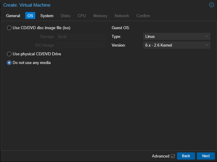 - Select “Do not use any media” in the “OS” tab because we will import the full image disk later, then press the “Next” button.
