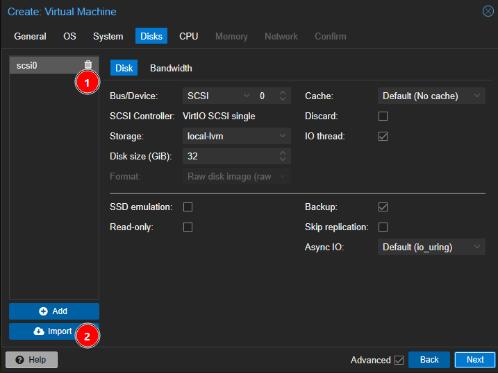 - In the “Disk” tab, remove the default disk and then click “Import”.