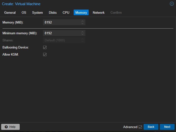 - In the Memory tab, allocate at least 8 GB (8192 MiB). Click Next.