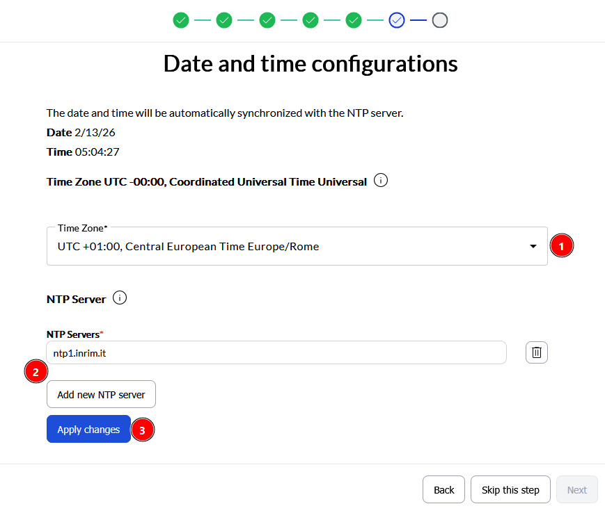 - Set your time zone and preferred NTP server, then click Apply changes.