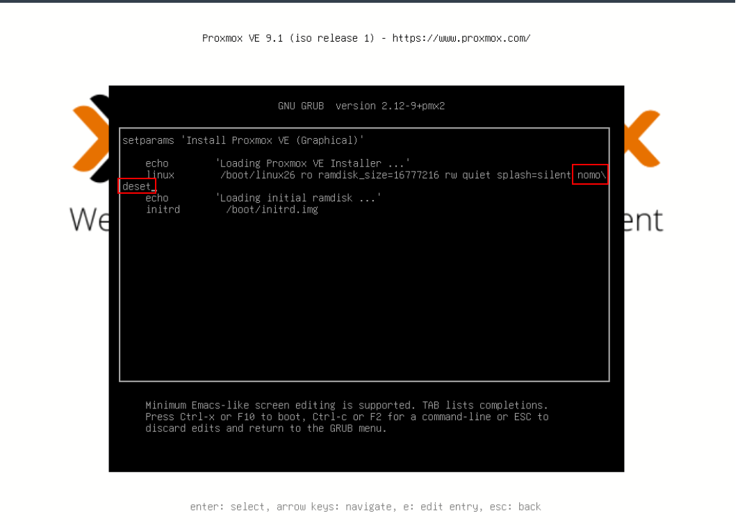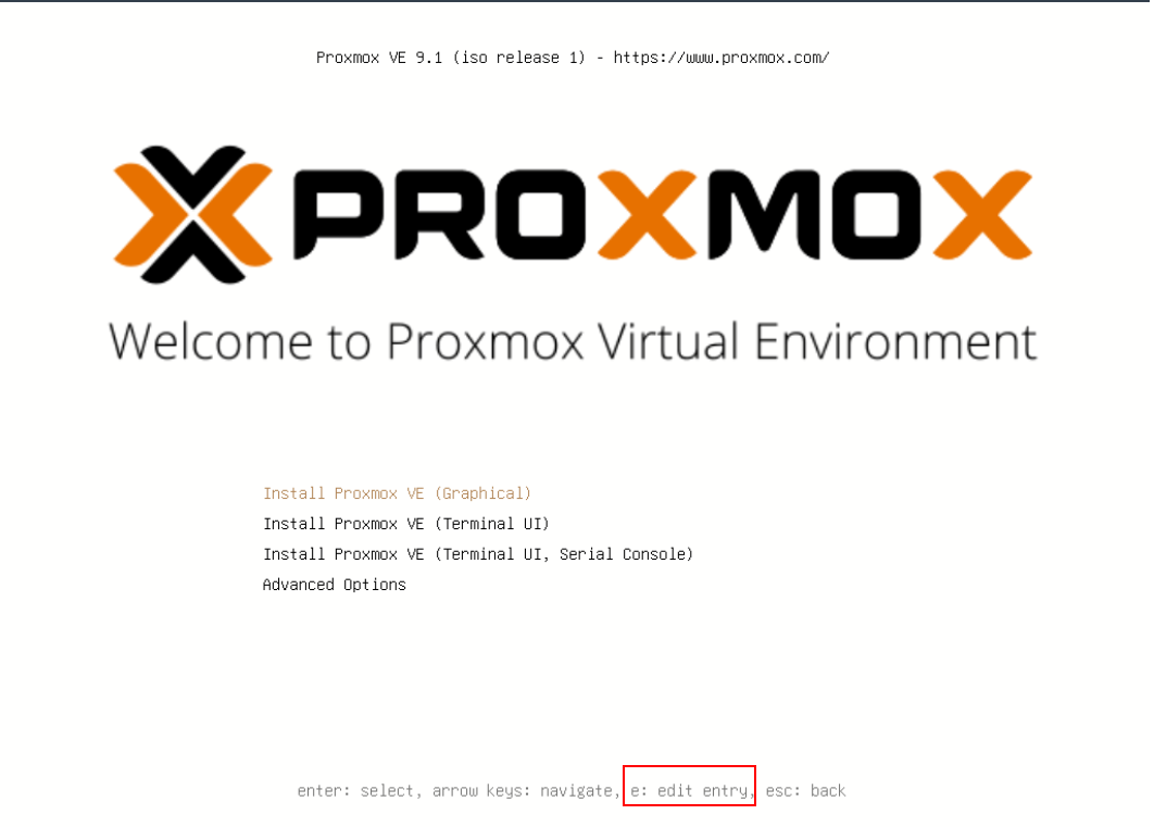 - When the Proxmox Installation menu is displayed, press “e” to edit the first choice.