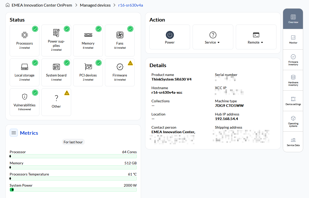 Figure 38. XClarity One Hub view from the XClarity One portal - You can take a look at the server status, metrics and details.