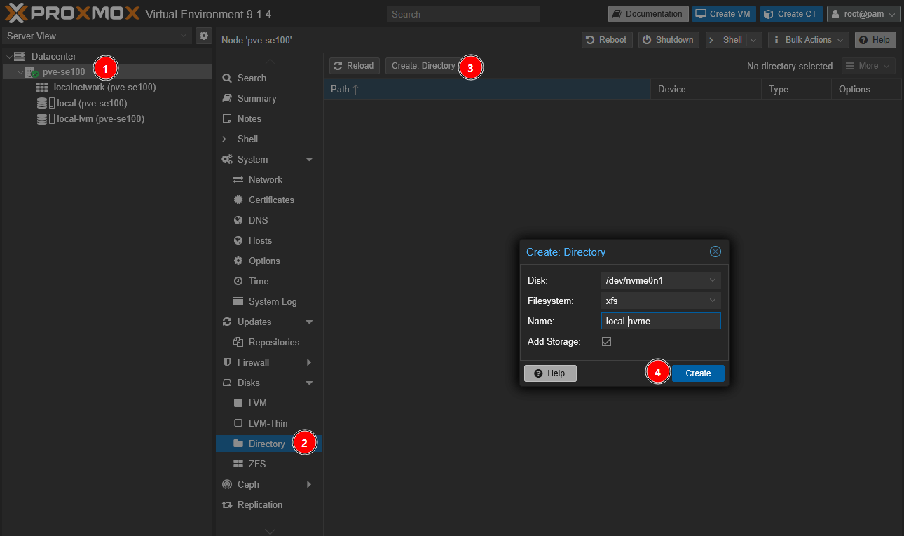 - In the Proxmox UI, select Datacenter > the host > Disks > Directory, then click Create Directory.