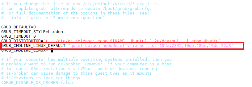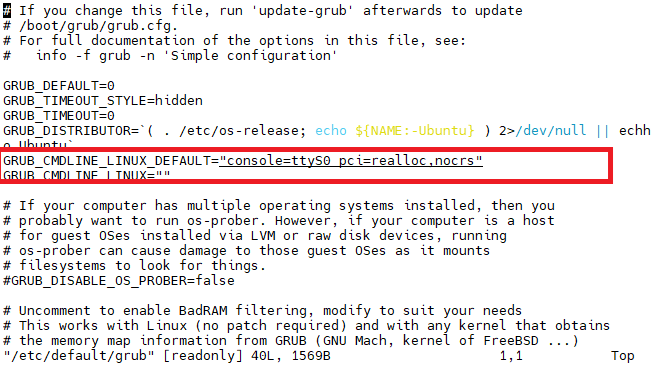 $ sudo vim /etc/default/grubEdit the lines highlighted in the figure below.