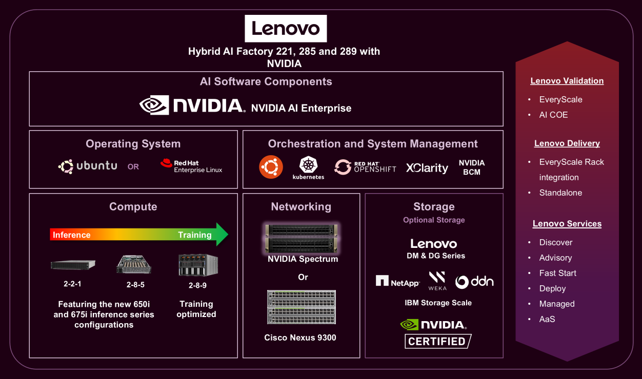 One example is the Lenovo Hybrid AI 285 platform, designed to accelerate enterprise AI deployments across hybrid environments. The platform leverages Lenovo ThinkSystem GPU-rich servers, supporting NVIDIA GPUs and the NVIDIA AI Enterprise software to power demanding AI workloads such as large-language-model inference, fine-tuning, and enterprise retrieval-augmented generation (RAG) pipelines.