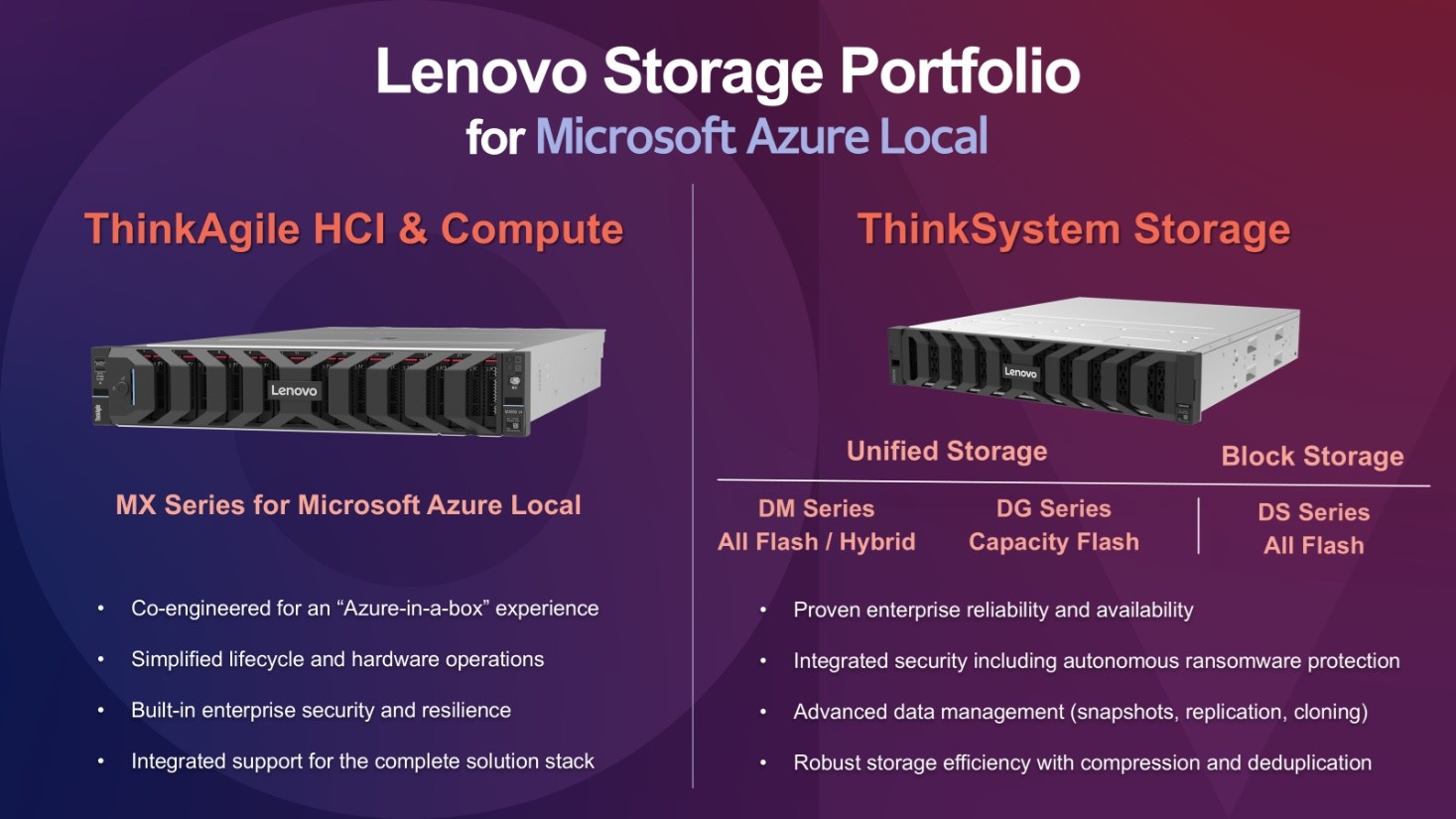 Built on ThinkAgile MX Series for compute and ThinkSystem enterprise storage arrays, this expanded portfolio delivers greater architectural choice for modern, sovereign Azure Local deployments.